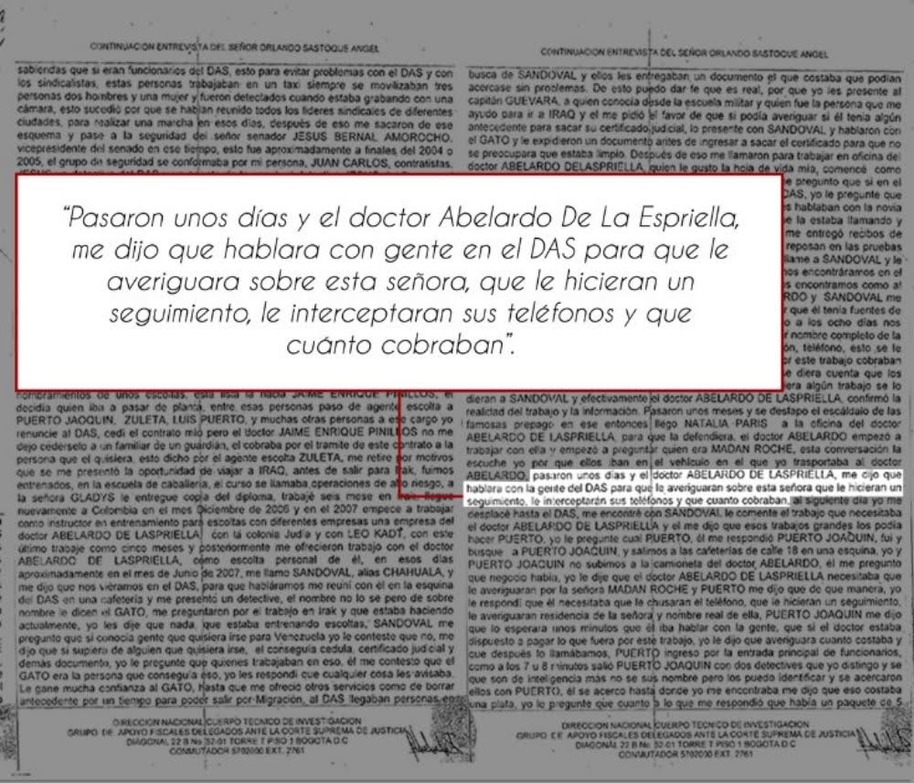 El caso es que, supuestamente, De La Espriella Otero le pidió otro encargo clandestino a los funcionarios del DAS. “Pasaron unos días y el doctor Abelardo De La Espriella, me dijo que hablara con gente en el DAS para que le averiguara sobre esta señora, que le hicieran un seguimiento, le interceptaran sus teléfonos y que cuánto cobraban”.