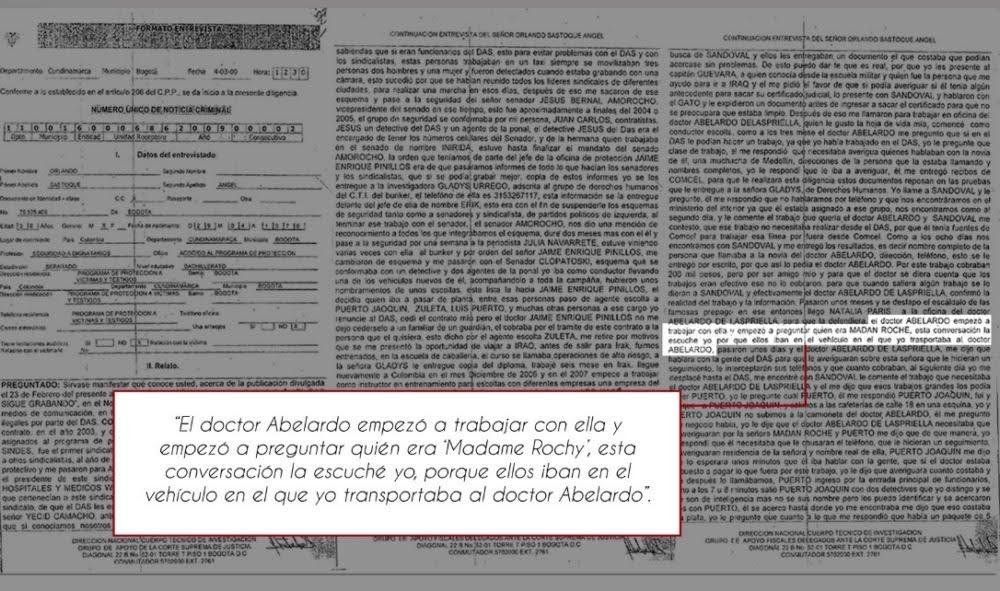 Según el ex detective del DAS “El doctor Abelardo empezó a trabajar con ella y empezó a preguntar quién era ‘Madame Rochy’, esta conversación la escuché yo, porque ellos iban en el vehículo en el que yo transportaba al doctor Abelardo”.