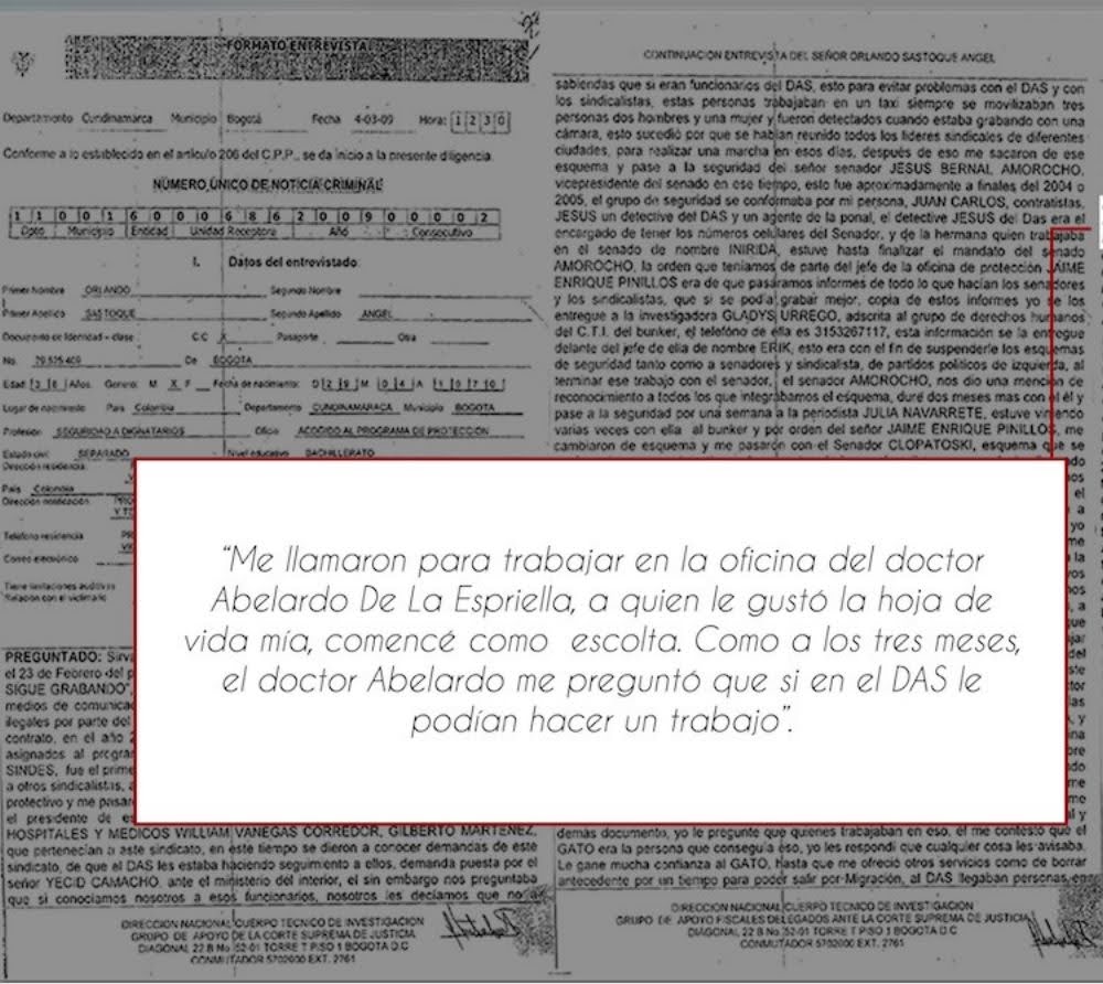 El 4 de marzo de 2009, apareció un ex escolta del DAS, adscrito al programa de protección de testigos de la Fiscalía General de la Nación, declarando que el abogado Abelardo De La Espriella era uno de los beneficiarios del trabajo sucio, siniestro y criminal que el organismo de inteligencia ejecutaba ilícitamente durante el gobierno de Álvaro Uribe Vélez, reseñó Julián Martínez Vallejoen pares.com.co.