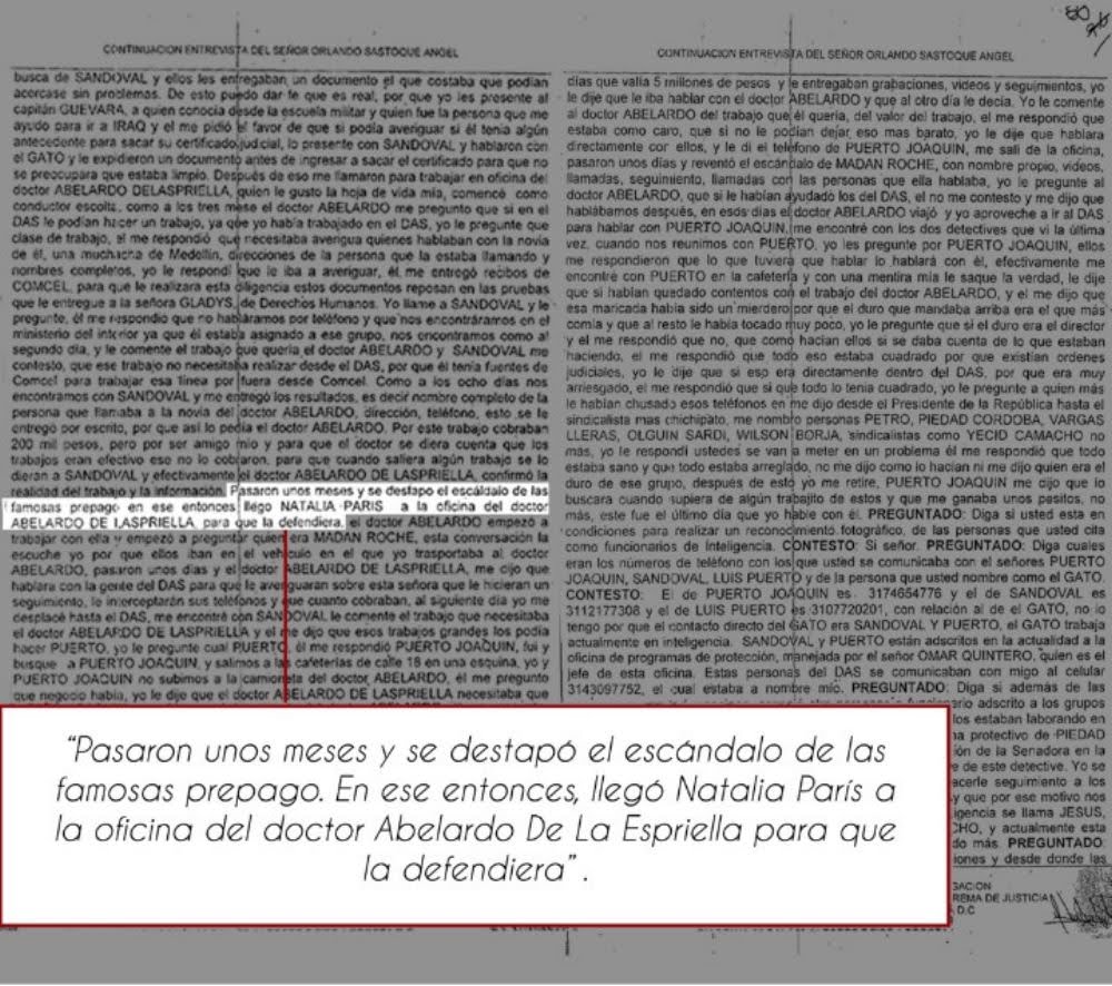 “Yo llamé a ‘Sandoval’ (…) y le comenté el trabajo que quería el doctor Abelardo y ‘Sandoval’ me contestó que ese trabajo no se necesitaba realizar desde el DAS, porque él tenía fuentes de Comcel para trabajar esa línea por fuera, desde Comcel”. ‘Sandoval’ era uno de los cuatro agentes del DAS que, según Sastoque, consiguieron la información de inteligencia ilegal que necesitaba Abelardo De La Espriella sobre las comunicaciones de su novia en 2007.