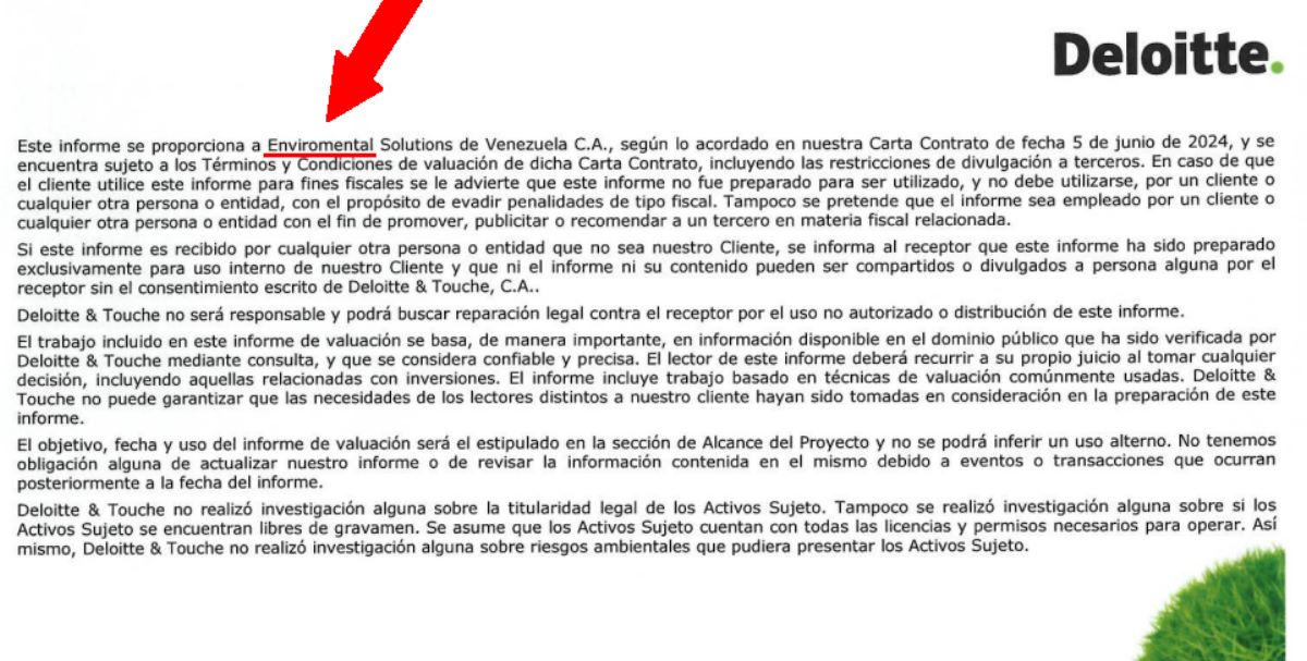 Sin embargo, una inspección más atenta de este supuesto aval revela una chapuza que delata la improvisación rampante que parece signar cada movimiento de CIVCA. En el documento que certifica la capacidad de Esvenca, una de las joyas de la corona de Vargas para este plan, Deloitte incurre en un descuido garrafal: el nombre de la empresa aparece repetidamente mal escrito como “Enviromental Solutions de Venezuela, C.A.”, omitiendo una “n” fundamental. El nombre correcto, “Environmental Solutions de Venezuela C.A.”, figuraba incluso en la propia (y ya desaparecida) página web de la compañía. Este error, lejos de ser una simple errata, es una metáfora perfecta del plan en su totalidad: una apariencia de solidez que se desmorona ante el más mínimo escrutinio.