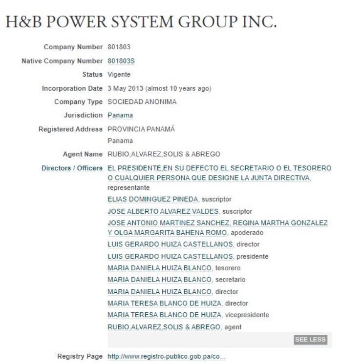 Luis Gerardo Huiza Castellanos figura en Panamá como presidente de la compañía H&B POWER SYSTEM GROUP INC.