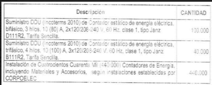 El contrato contemplaba el suministro de 140 mil contadores de energía y el montaje de 440 mil contadores de energía, incluyendo materiales y accesorios. La negociación estaba enmarcada en el proyecto plan nacional de respaldo al sistema de transformadores de potencia y sistema de control de demanda del convenio binacional luso venezolano.