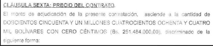 El monto total del contrato era por un componente nacional presupuestado en Bs. 356.331.359,70 y un componente en moneda e