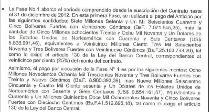 Fase 1: Pago del anticipo compuesto por un monto en bolívares de Bs. 7.071.645,25 y otro en dólares por USD 5.838.091,46, correspondiente al 25 por ciento del contrato.