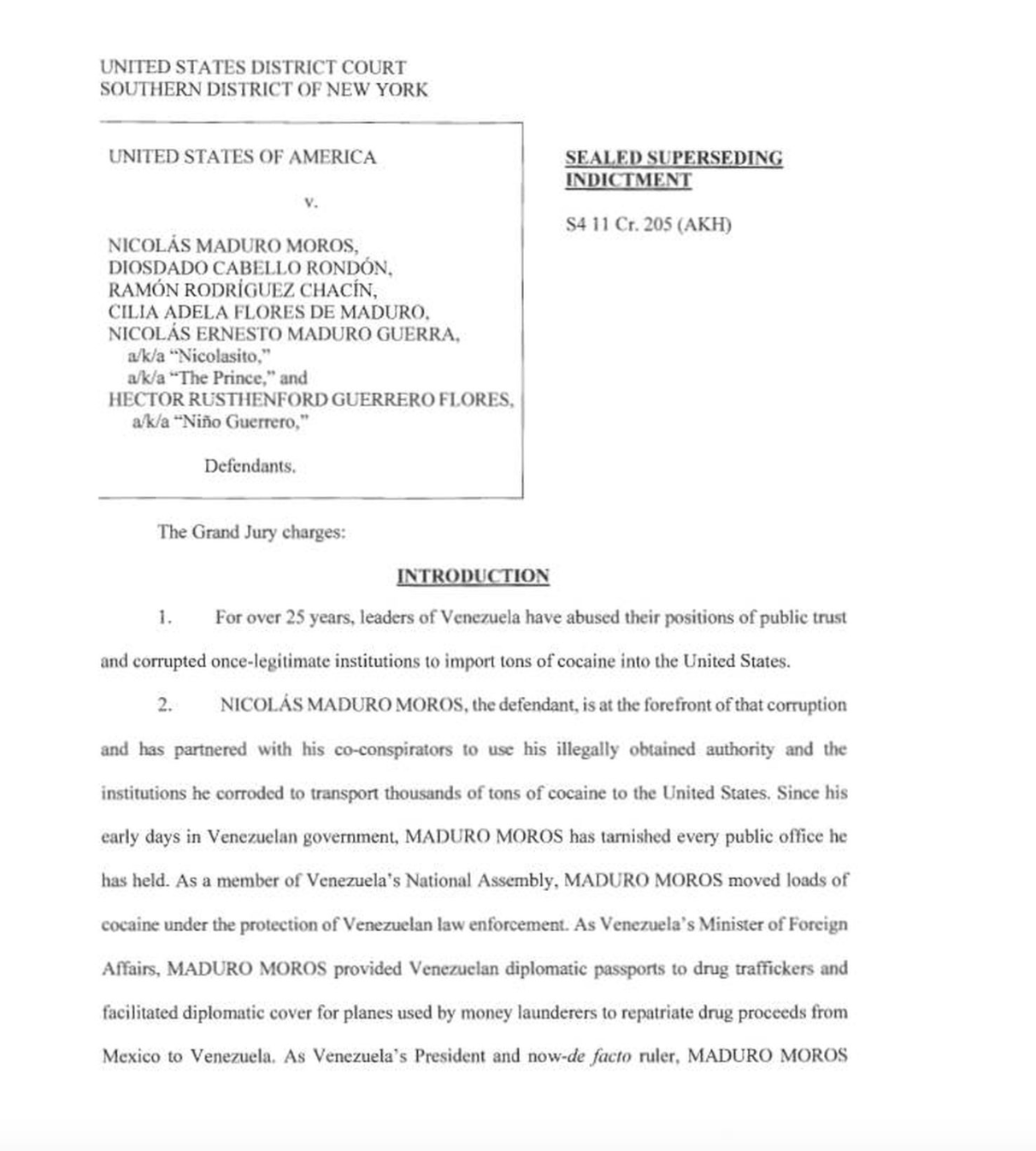 La acusación vigente contra el mandatario incluye conspiración para el narcoterrorismo, conspiración para importar cocaína, posesión de ametralladoras y artefactos destructivos, así como conspiración para su posesión en perjuicio de Estados Unidos.