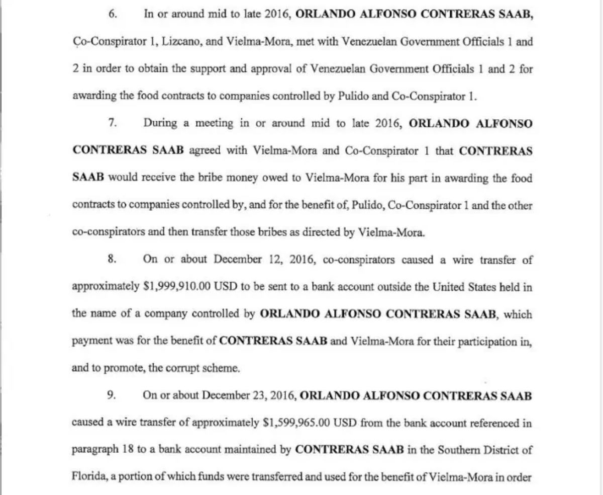 “Contreras Saab acordó con (…) Pulido pagar sobornos en beneficio de funcionarios del Gobierno venezolano, incluido Vielma Mora, a cambio de su ayuda para obtener contratos para suministrar alimentos al pueblo de Venezuela a través de Cobiserta y Corpovex”, especifica el escrito judicial.
